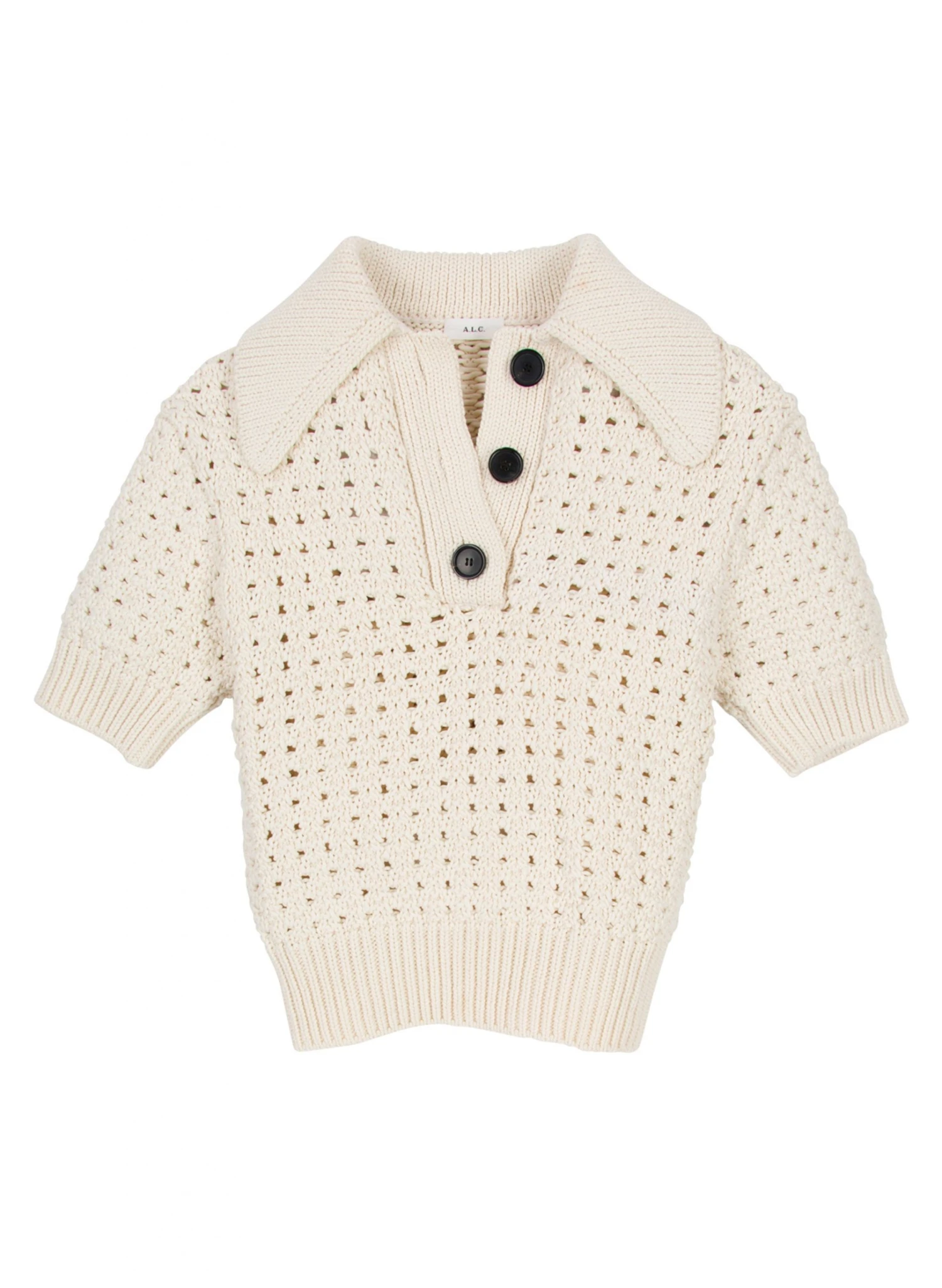 The Archer Top is knitted from chunky cotton in a soft cream shade. This short-sleeve silhouette features an open-weave and oversized details, including the polo collar and button placket.