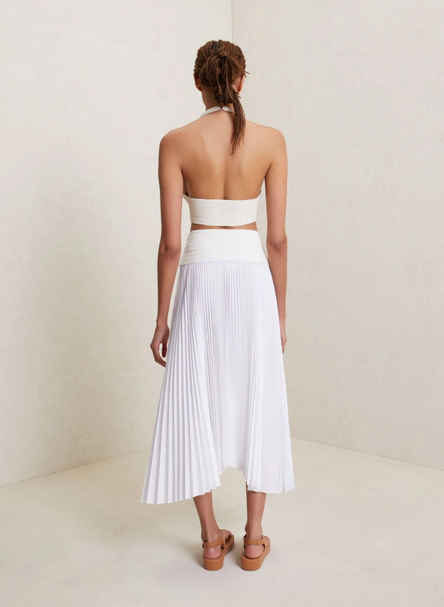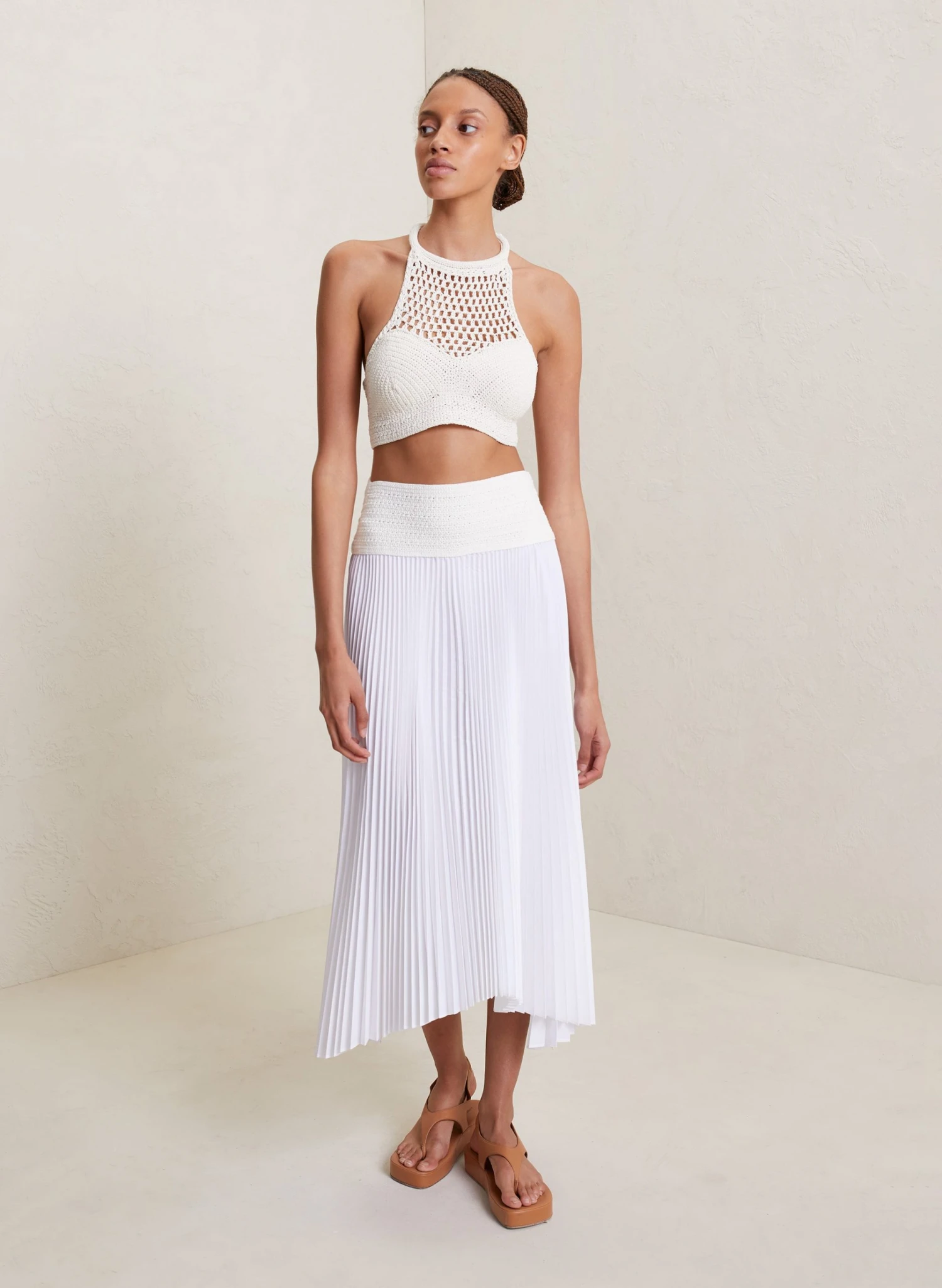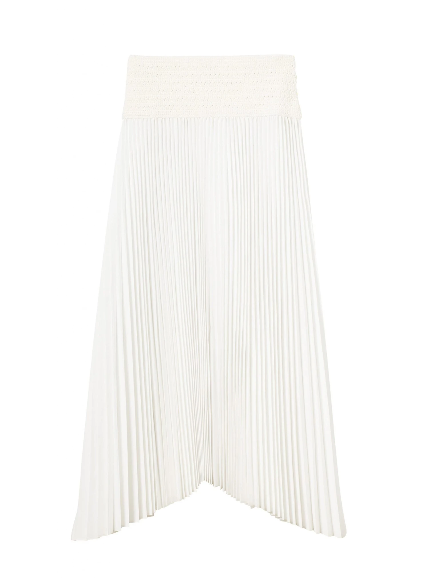 The Sierra Skirt is knitted from an airy cotton blend at the waist and combined with a fluid, pleated skirt in a soft off-white hue. This midi silhouette features an asymmetric hemline that sways with every step.