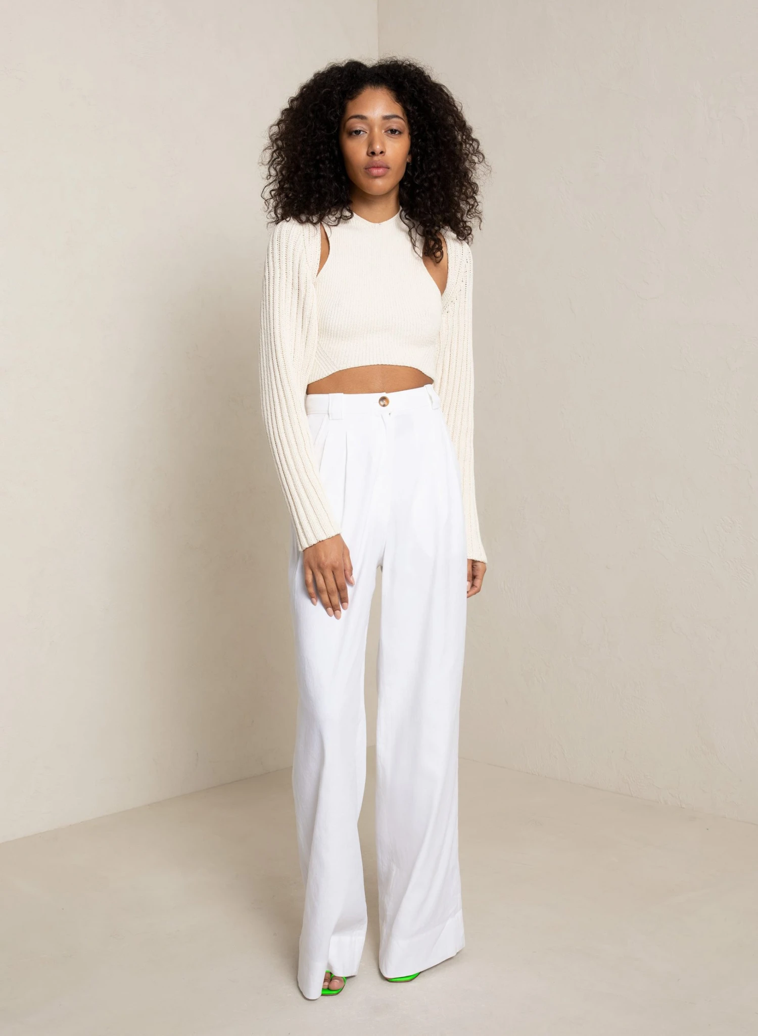 The Caleb Top is knitted from a cotton blend in an ivory hue. This cropped silhouette features a notched high neckline that wraps to the open back to criss-cross and tie.