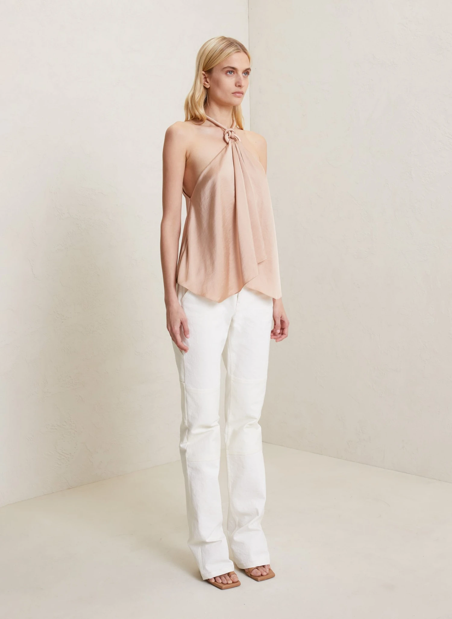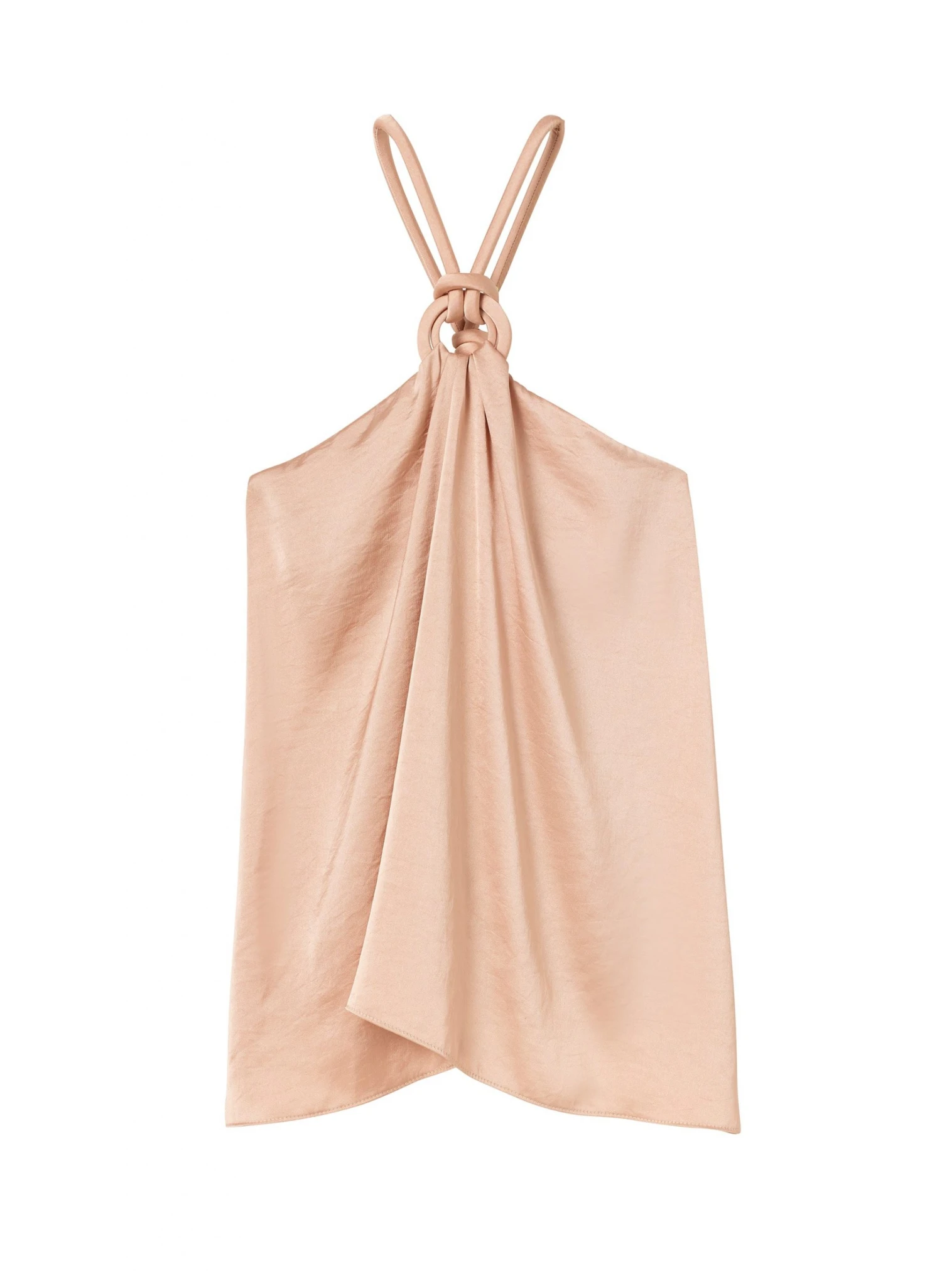 The Calypso Top is crafted from our stretch satin in a lustrous champagne hue. This handkerchief silhouette features a halter neckline with a ring detail that knots in the back for an easy, fluid fit.