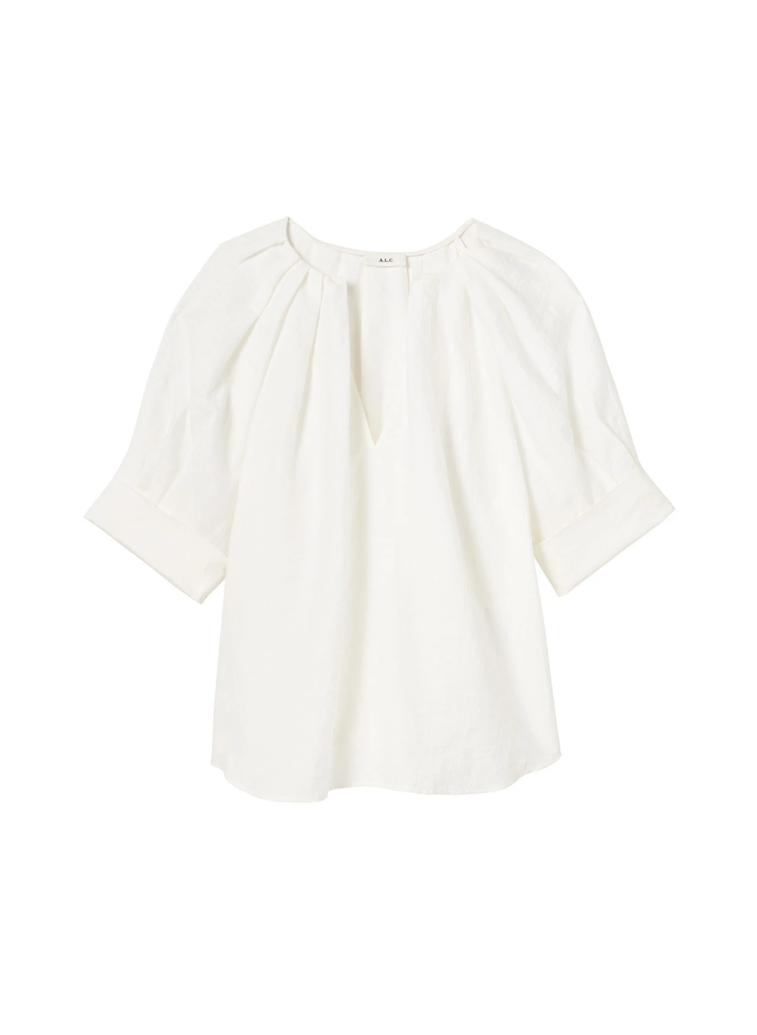 The Carey Top is crafted from an airy linen-cotton blend in crisp white. This voluminous silhouette features short cuffed sleeves and a pleated neckline that you can wear closed for a rounded key-hole shape or open for a V-shape.