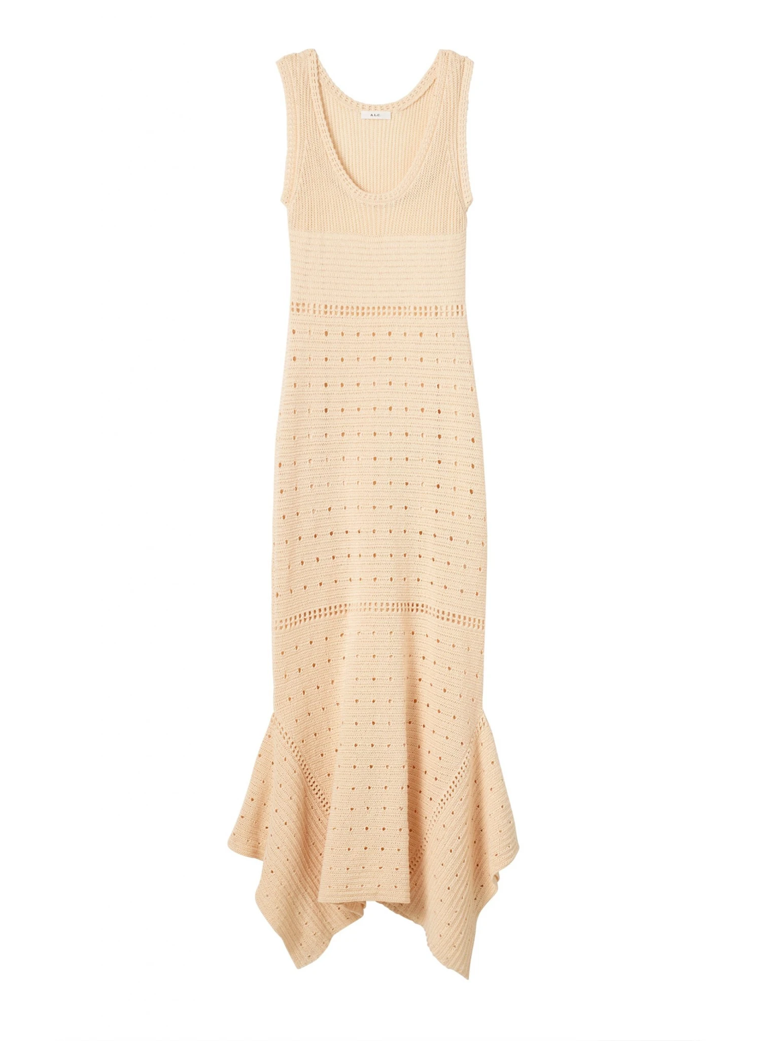 The Carlota Dress is knitted from soft cotton in a pale yellow hue. This ankle-skimming silhouette is partially lined, with a handkerchief hem and round neckline.