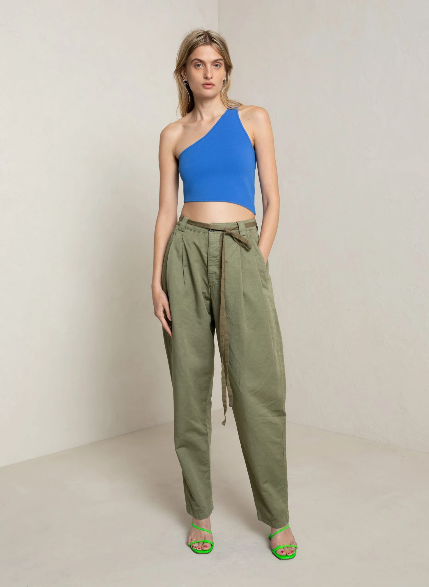 The Colby Top is crafted from soft viscose in a vibrant blue hue. This one-shoulder silhouette is fitted and cropped for an asymmetric shape. Shop Knitwear