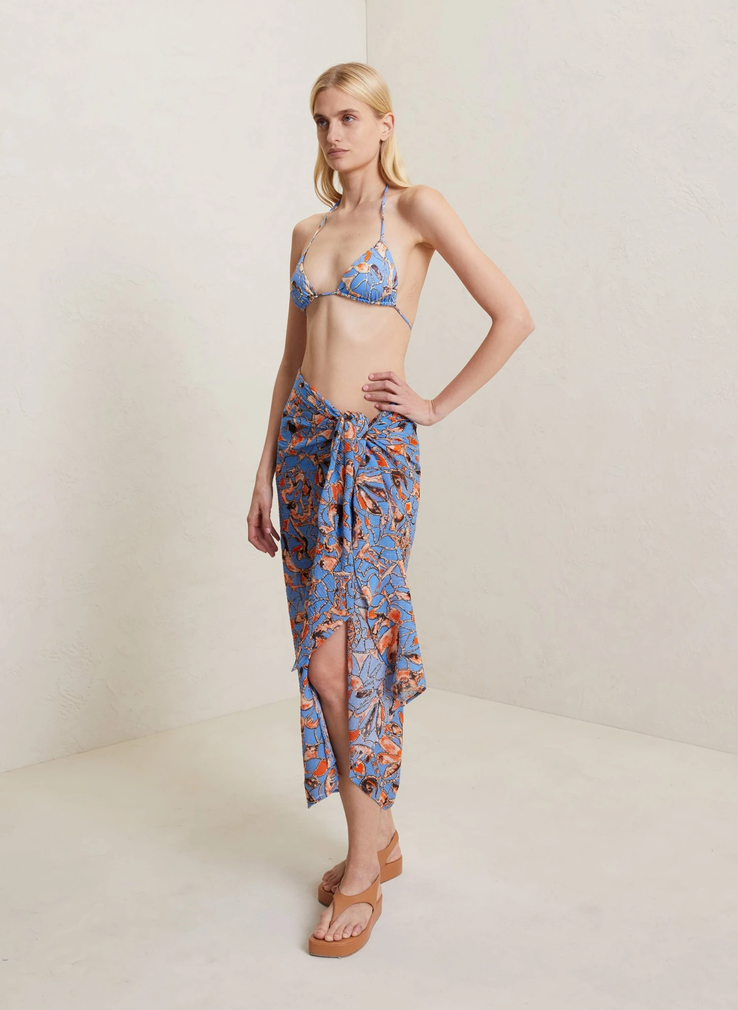The Devin Triangle Bikini Top is crafted from our recycled nylon blend in a blue and orange abstract floral pattern for a vibrant two-piece look.