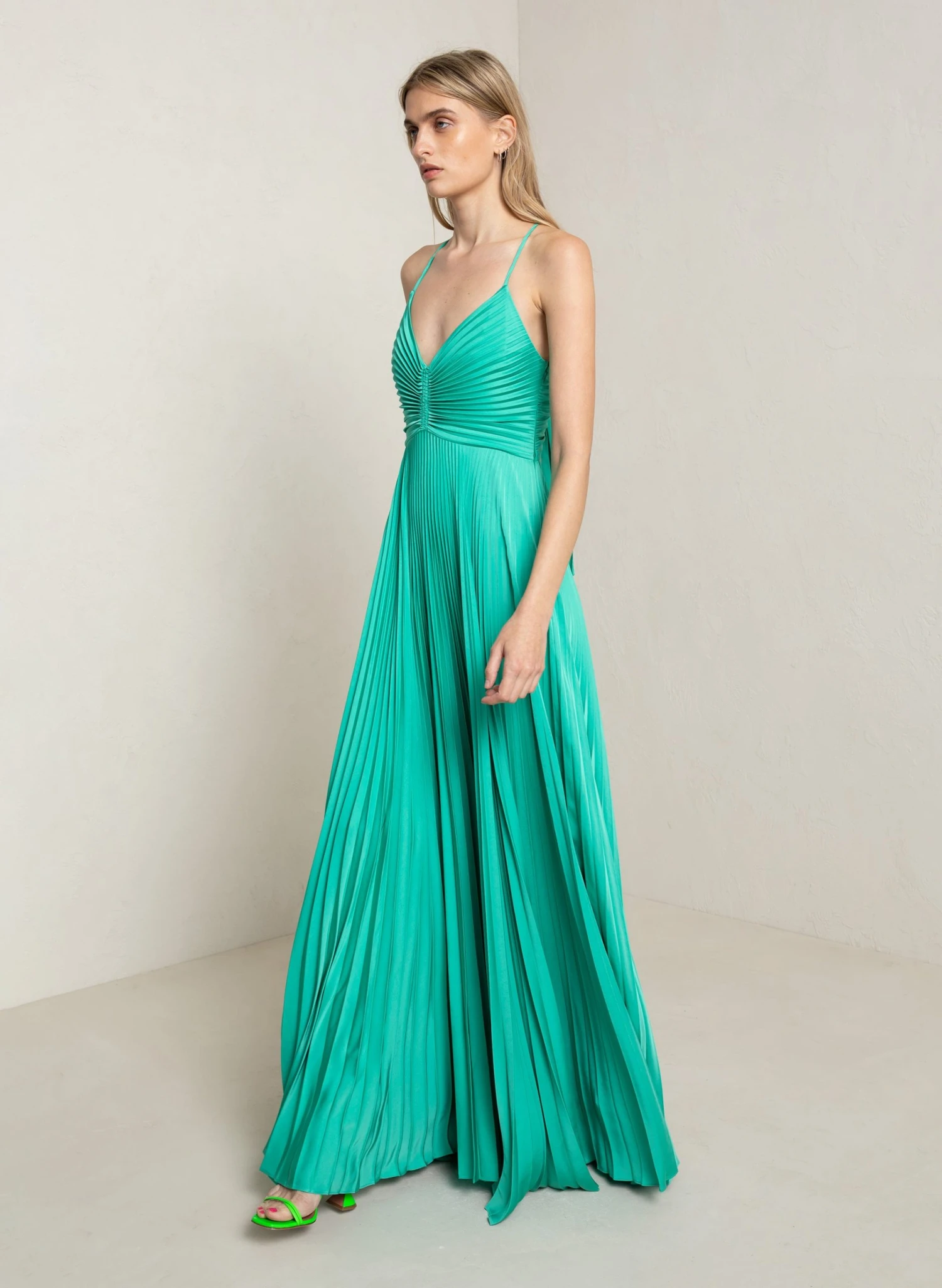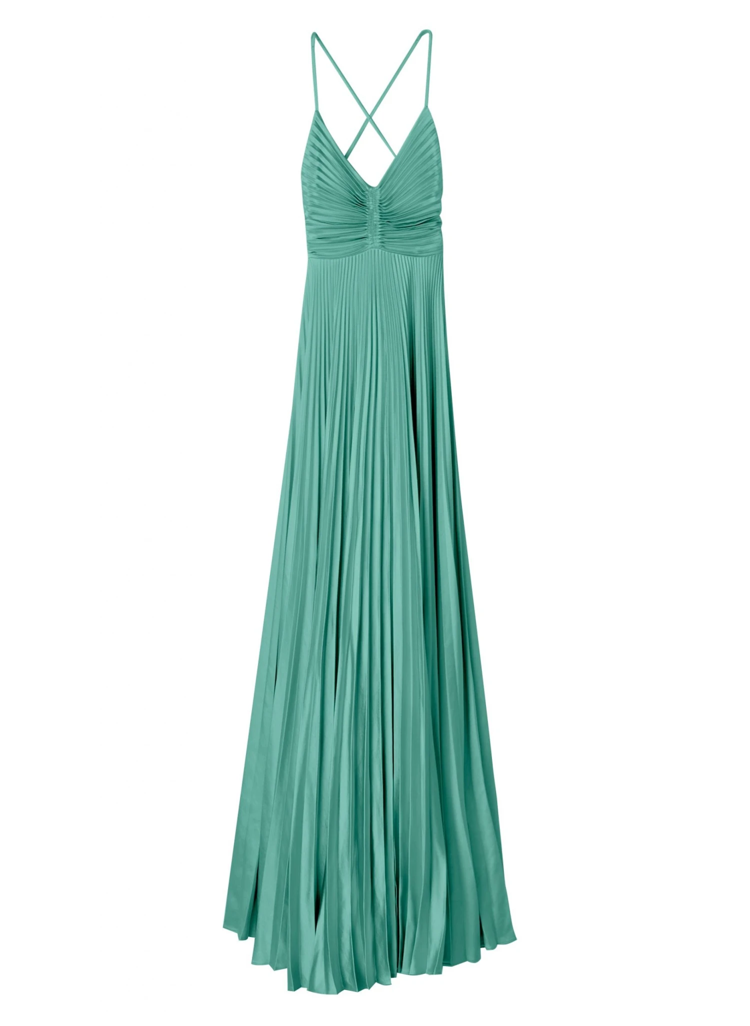 The Aries Dress is crafted from our vintage satin in an emerald green hue. This maxi silhouette features a V-neckline and pleating throughout with a ruched bodice that wraps to the back, revealing a low cutout. Shop Dresses