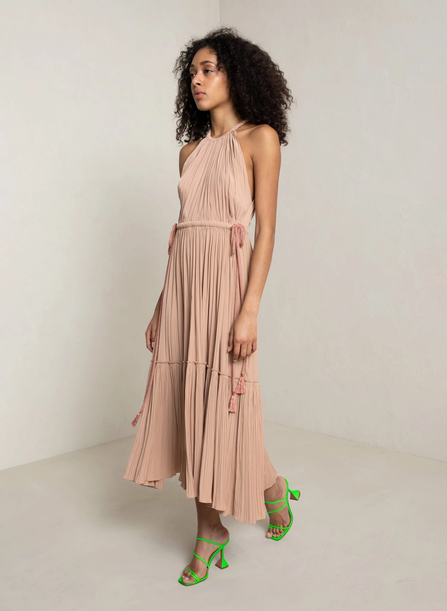 The Ella Dress features beautiful pleating that sways with every step in a dusty pink hue. This fluid midi silhouette features a halter neckline, tiered skirt, and draw cord waist to cinch as desired. Shop Dresses