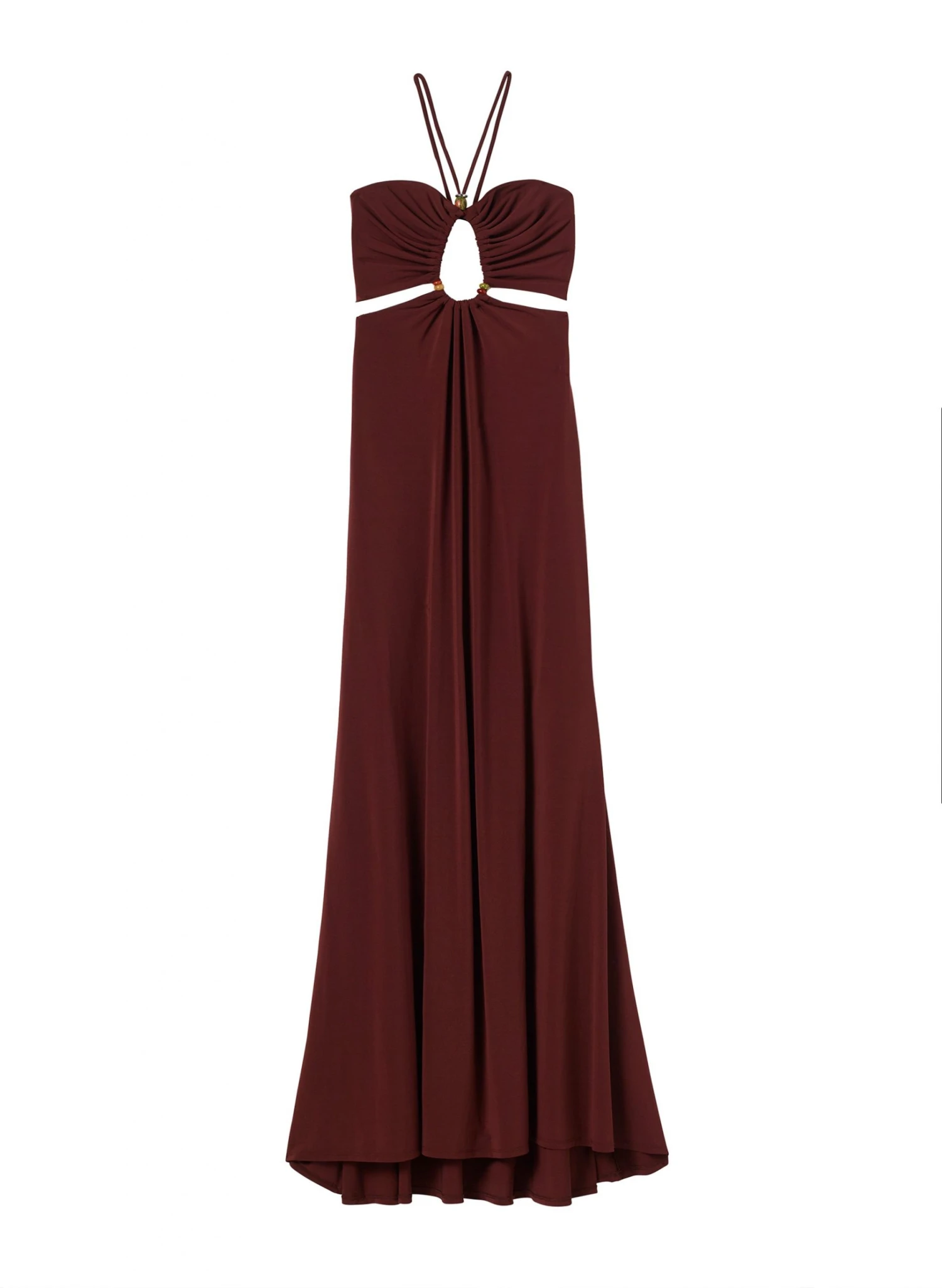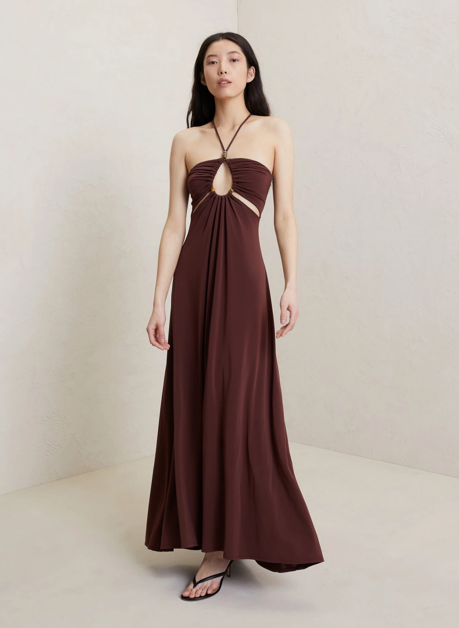 The Gabrielle Dress is crafted from a stretch viscose blend in a rich chocolate brown. This maxi silhouette features a halter neckline detailed with colorful beads and cutouts through the bodice that extends to reveal an open back. Shop Dresses