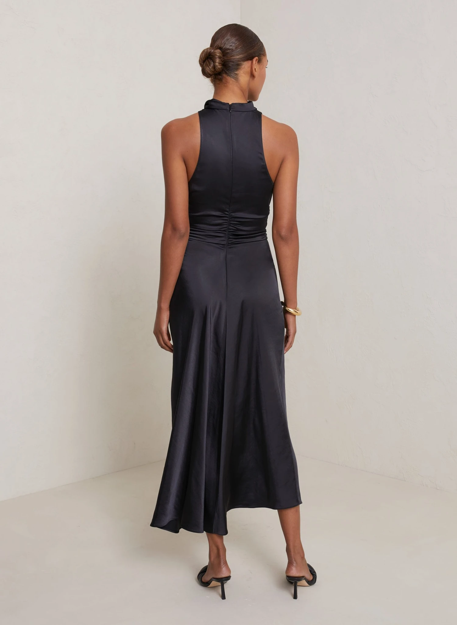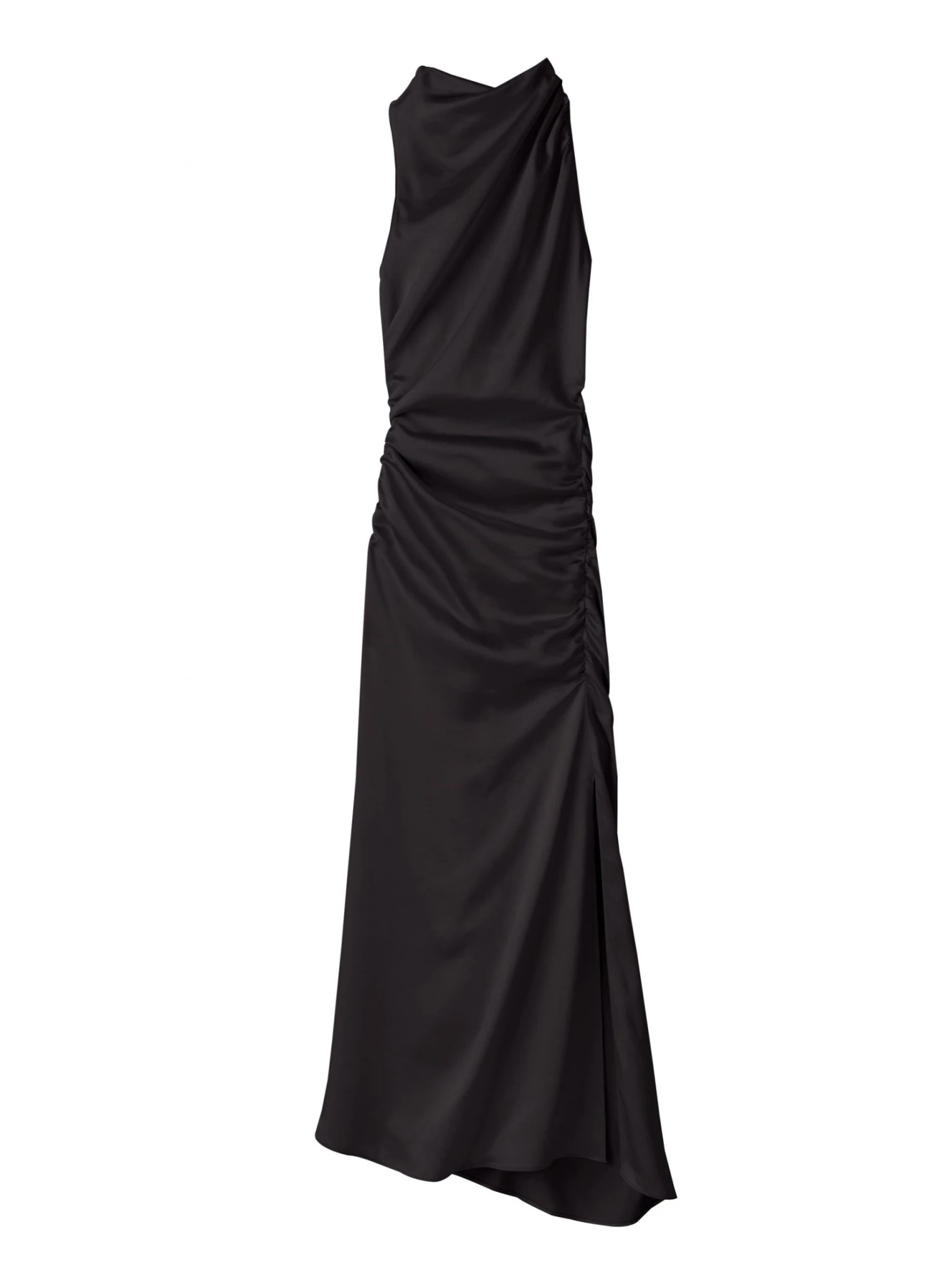 A delicately draped neckline gives way to a body-skimming silhouette and leg-baring slit. Featuring a touch of stretch, this textured satin dress is the final word in cocktail attire. Shop Dresses