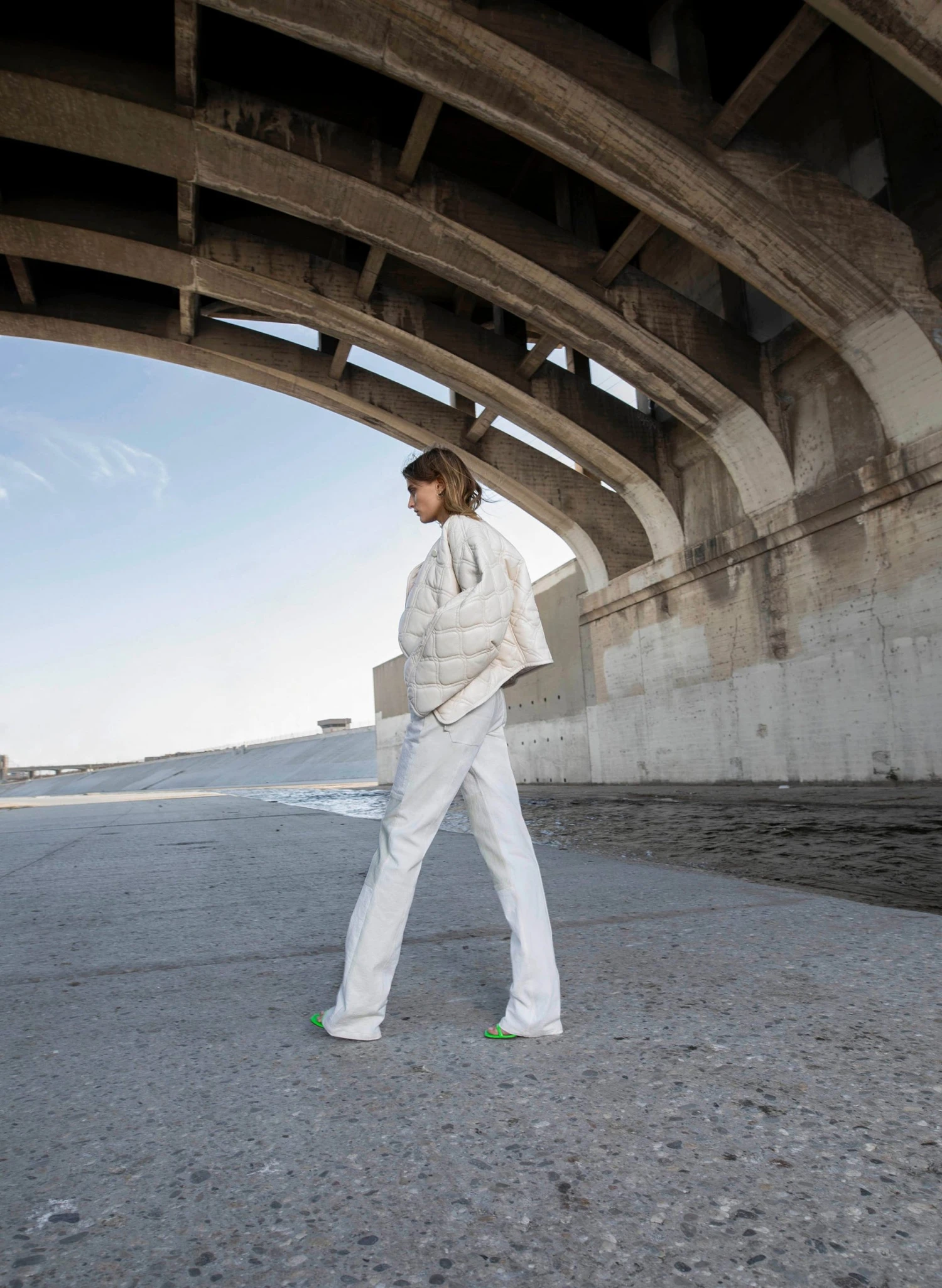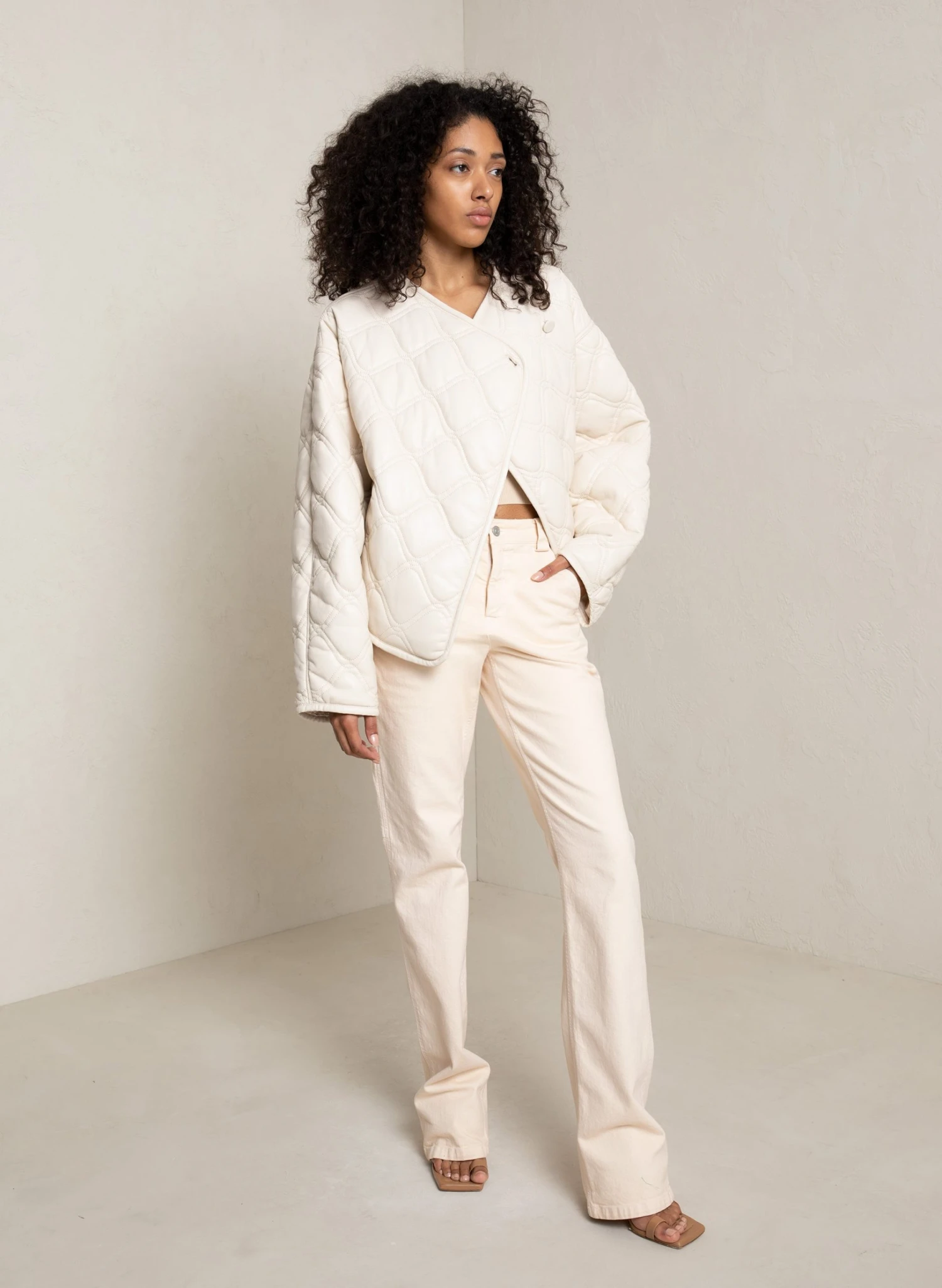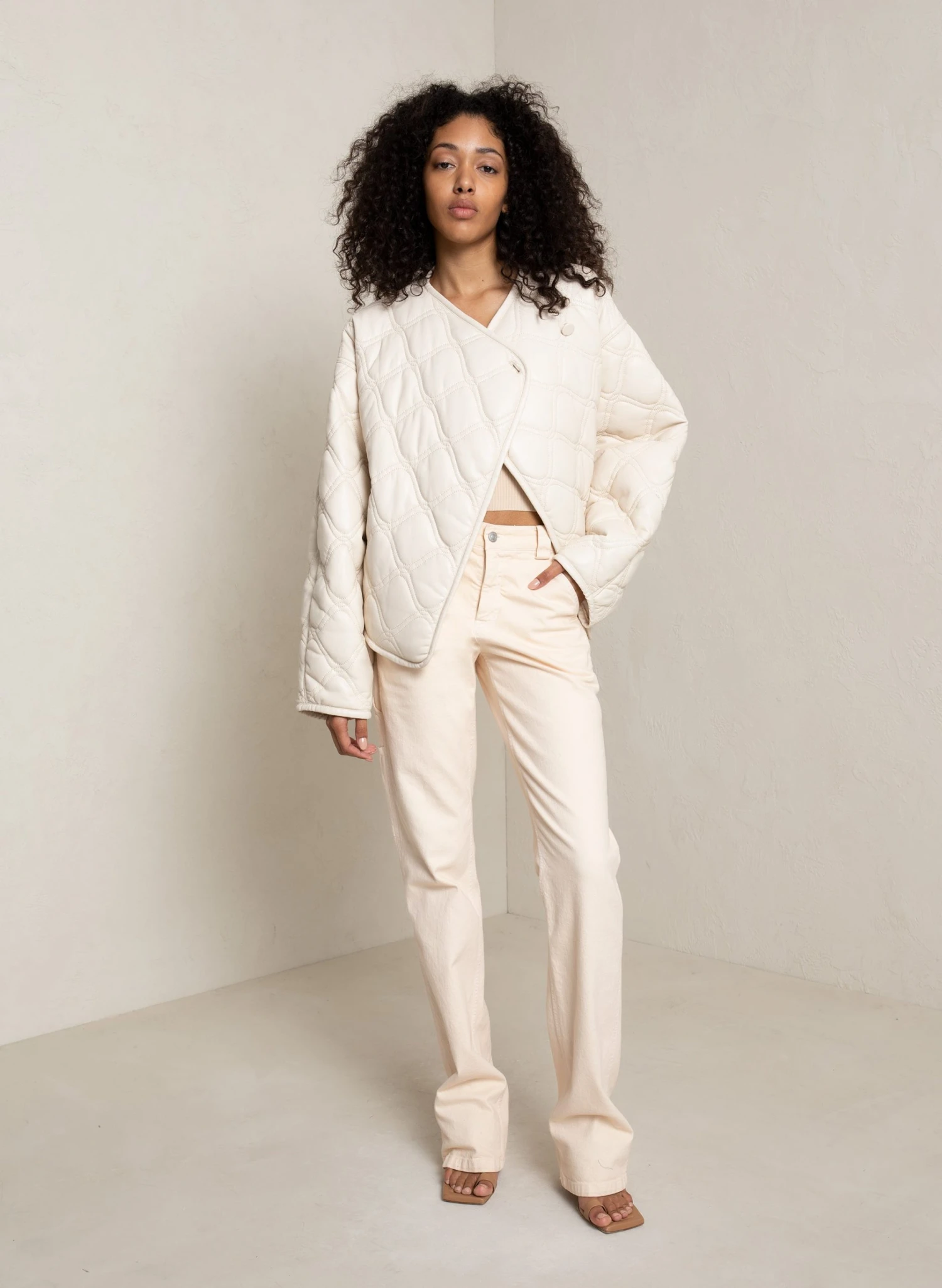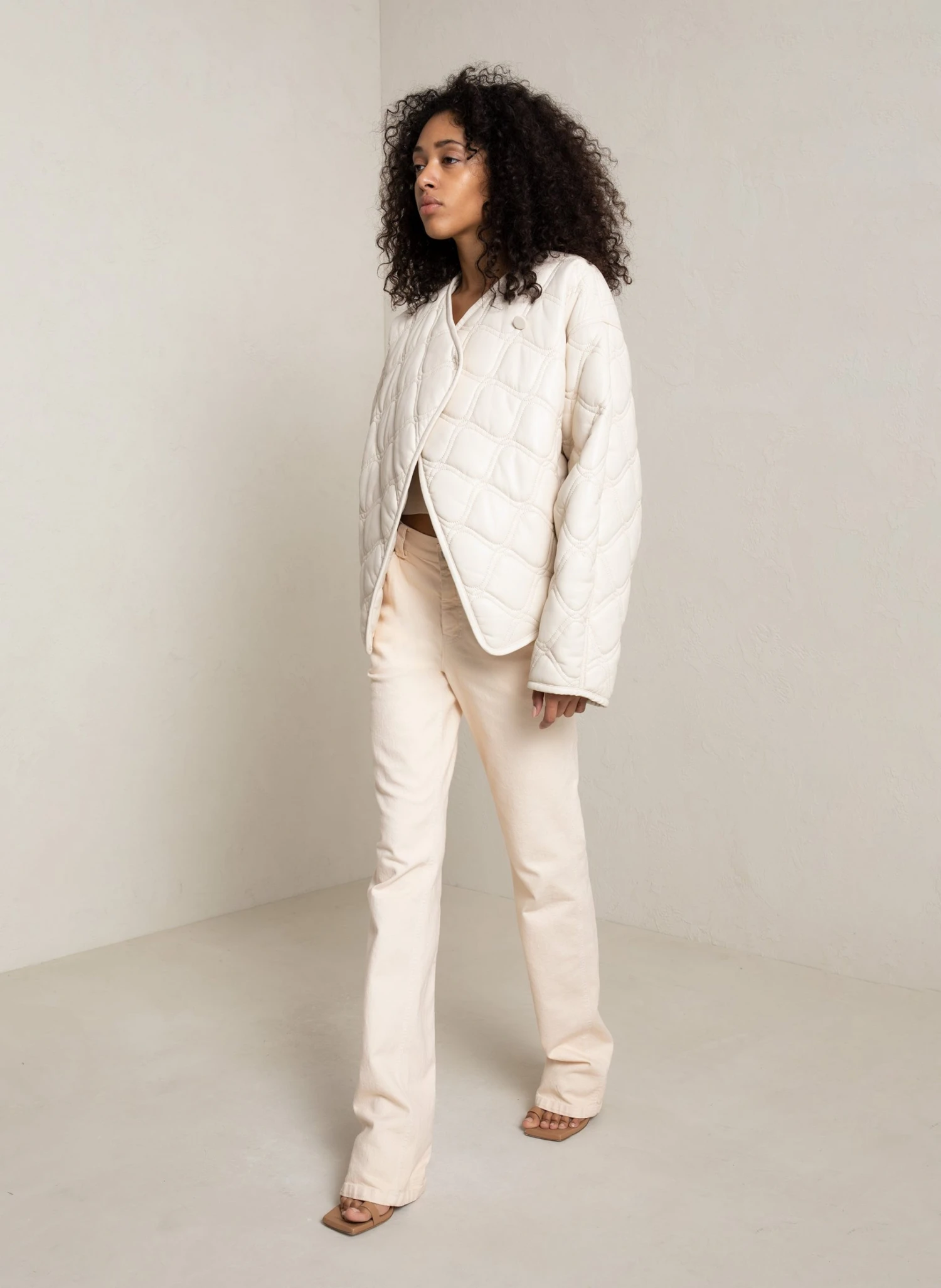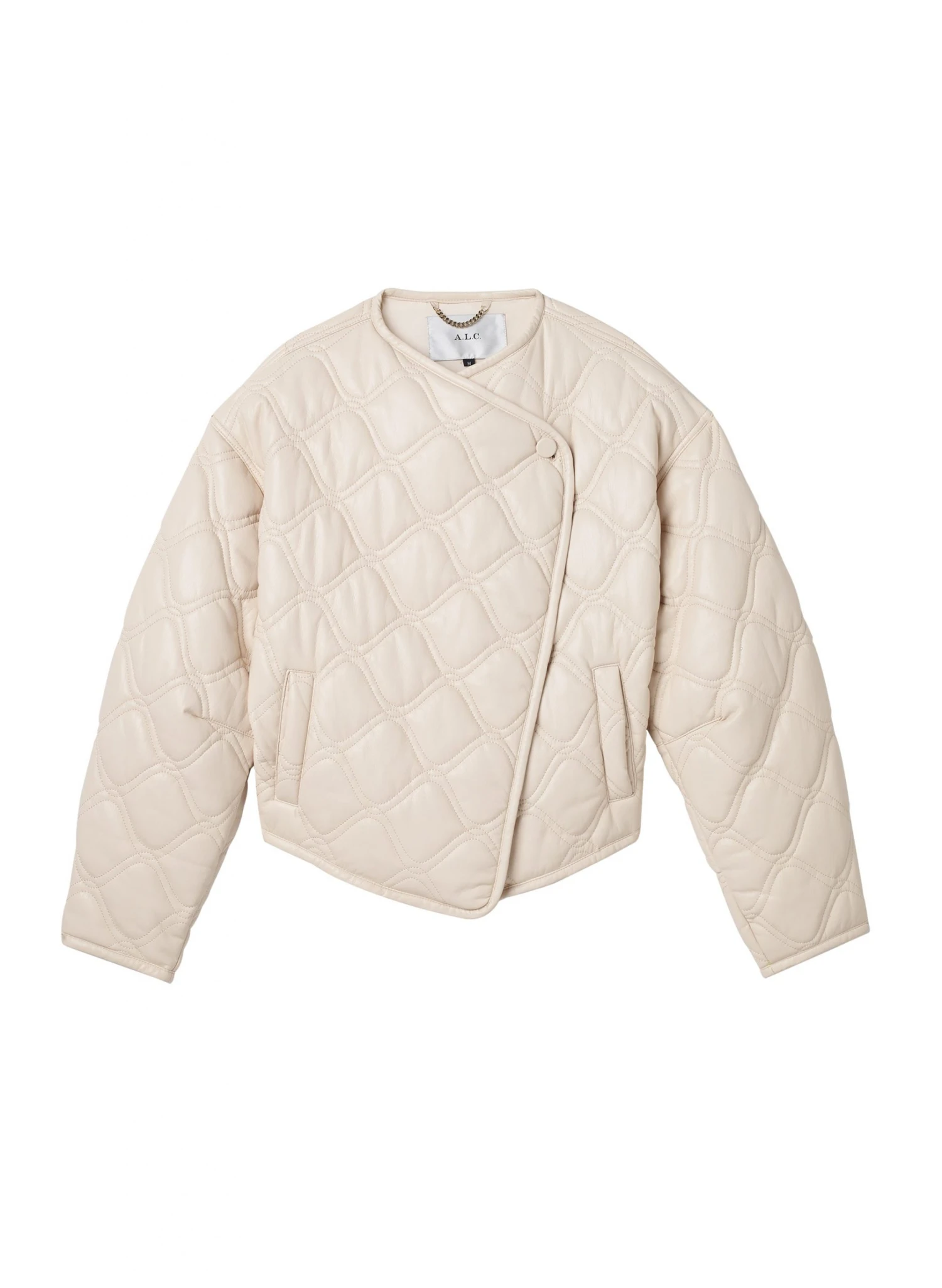The Emory Jacket is quilted from cream vegan leather fabric. This voluminous shape features roomy sleeves, a button closure, and piped hems for a clean finish.