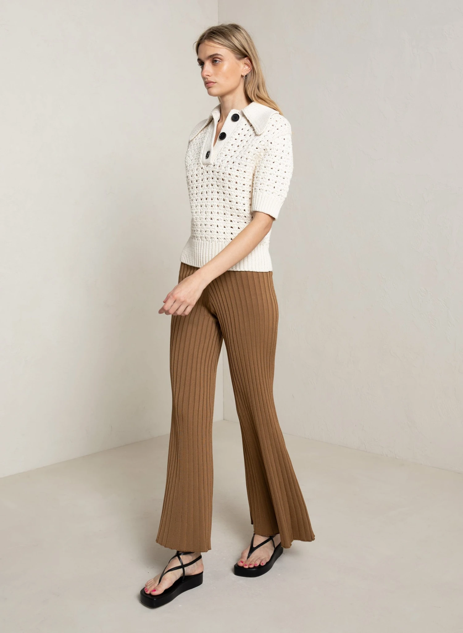 The Astrid Pant is knitted from so-soft viscose in a warm brown hue. This ribbed design features gently flared legs and a comfortable stretch waist.