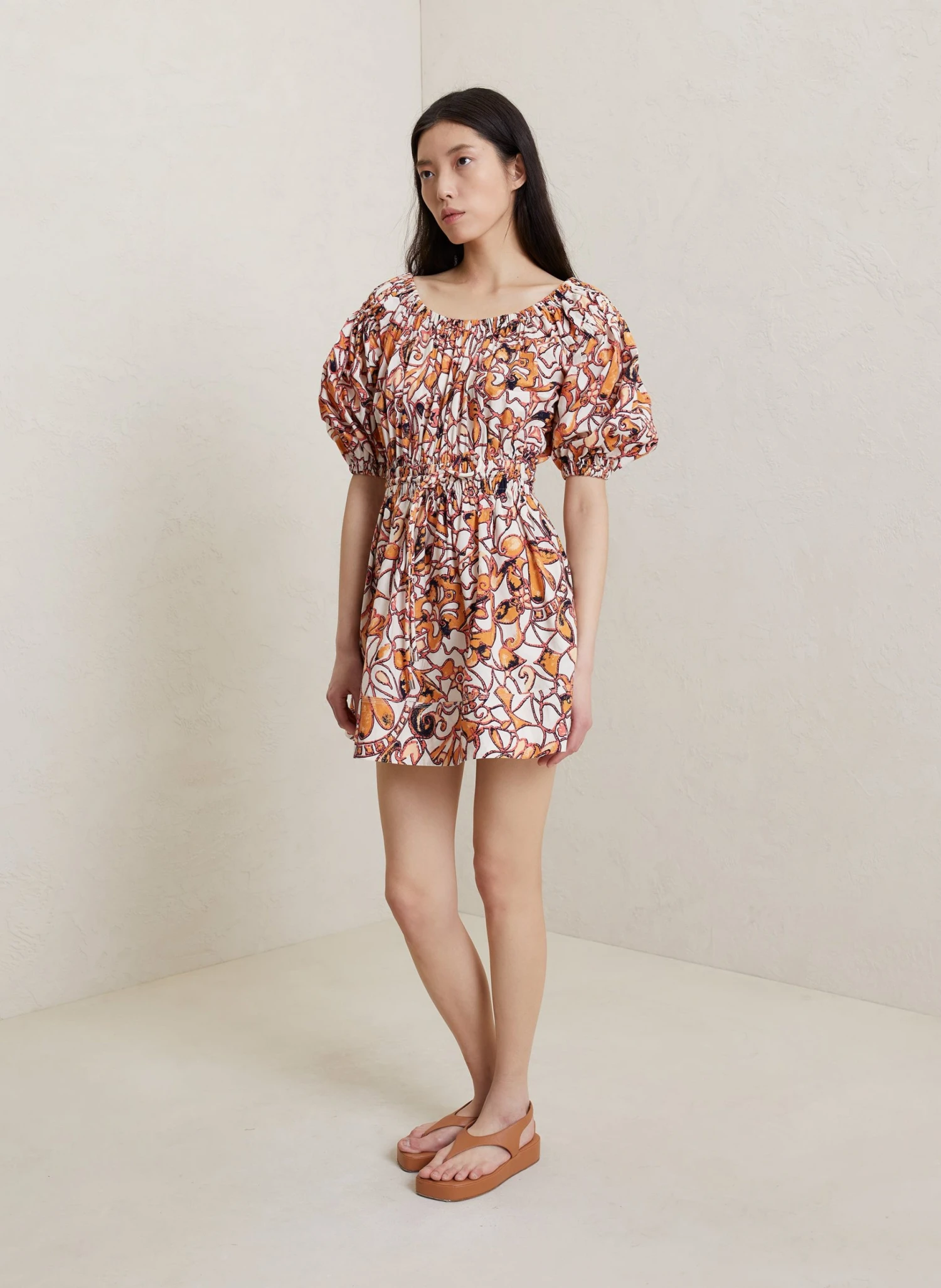 The Maya Dress is crafted from crisp washed cotton in a white and orange abstract floral pattern. This mini silhouette features an elasticized neckline, drawstring waist, and puff sleeves that can be styled on or off the shoulders. Shop Dresses