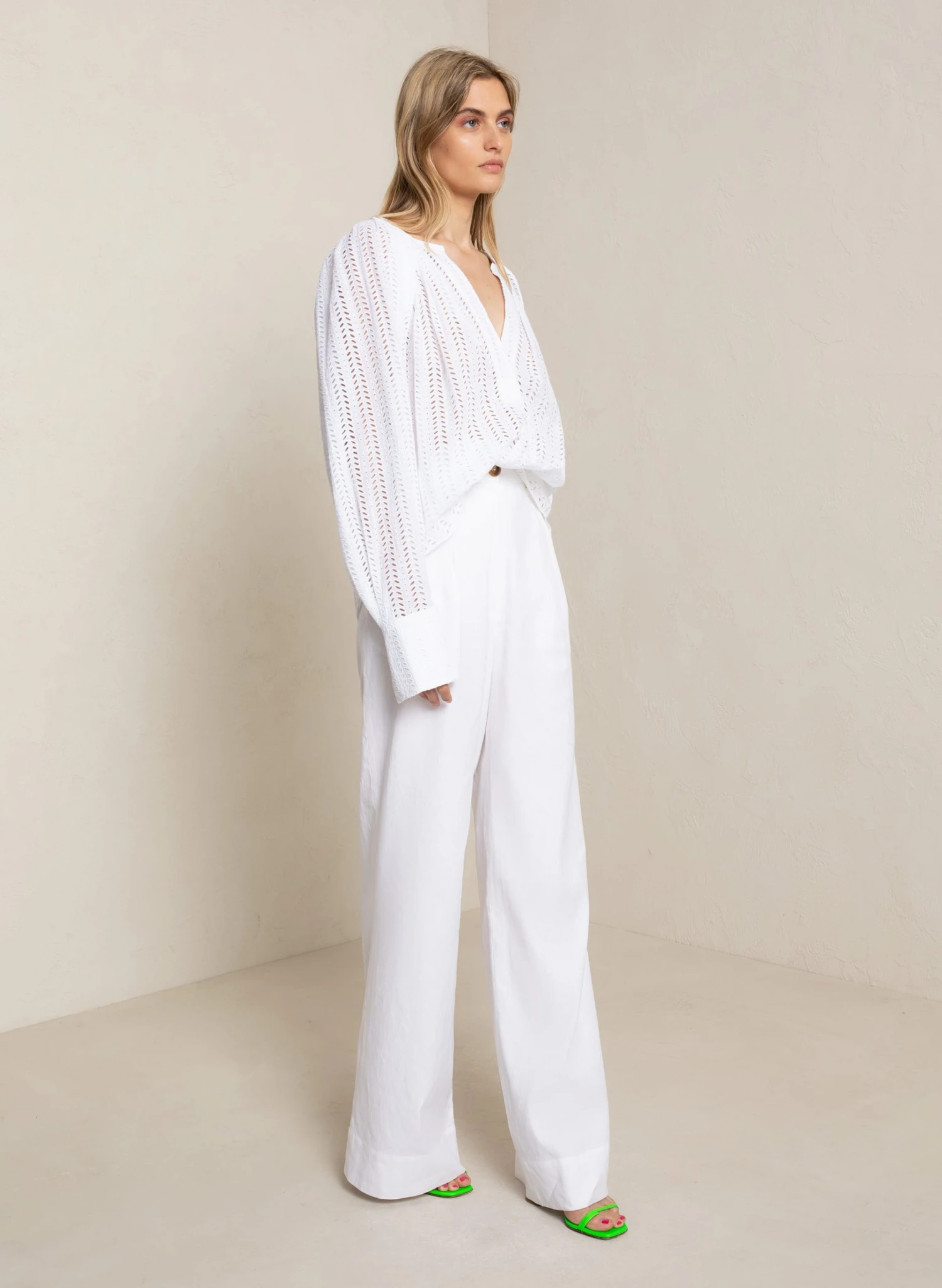 The Nomad Top is crafted from 100% cotton in off-white. This voluminous and pleated silhouette features long cuffed sleeves and a V-shaped placket neckline.