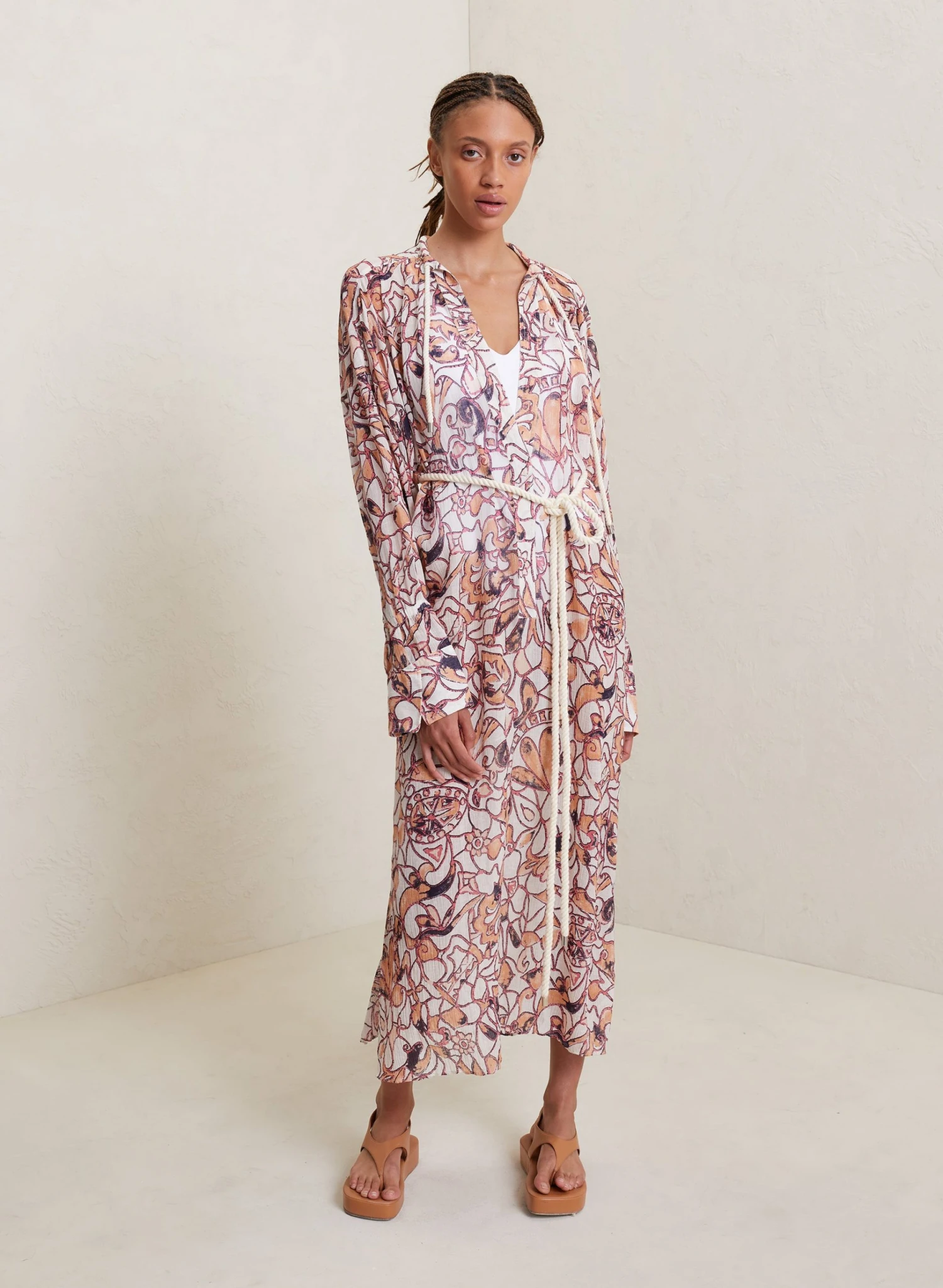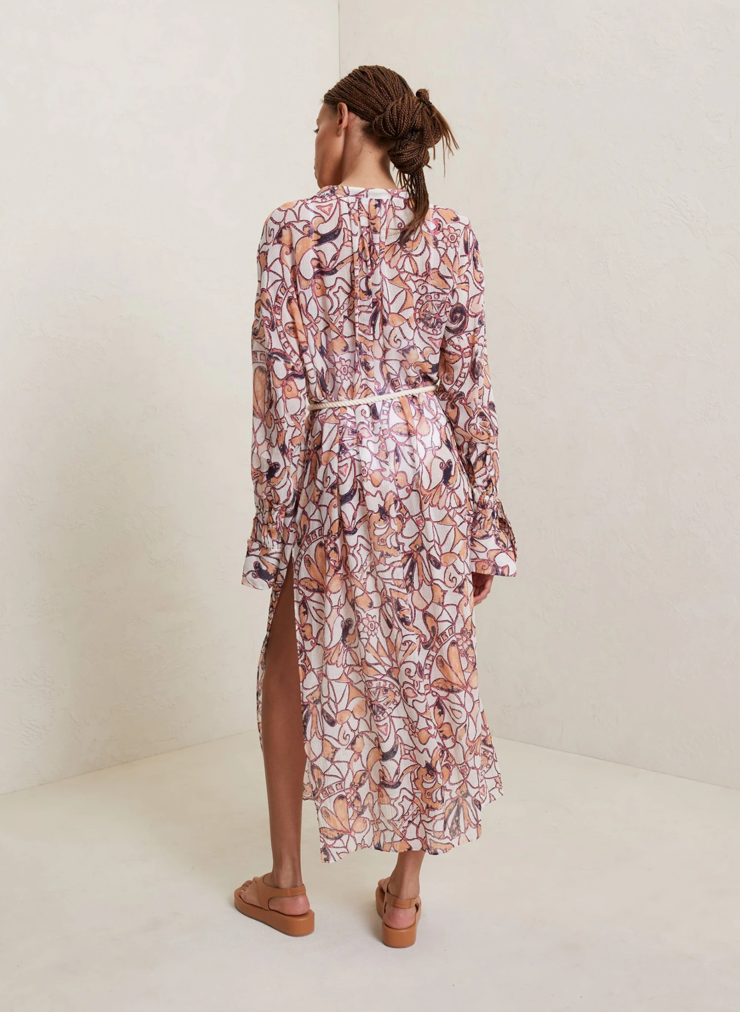 The Palma Coverup is crafted from our solid silk-linen blend in a white abstract floral print. This maxi silhouette is cut for a roomy fit, featuring a plunging V-neckline and voluminous long sleeves.