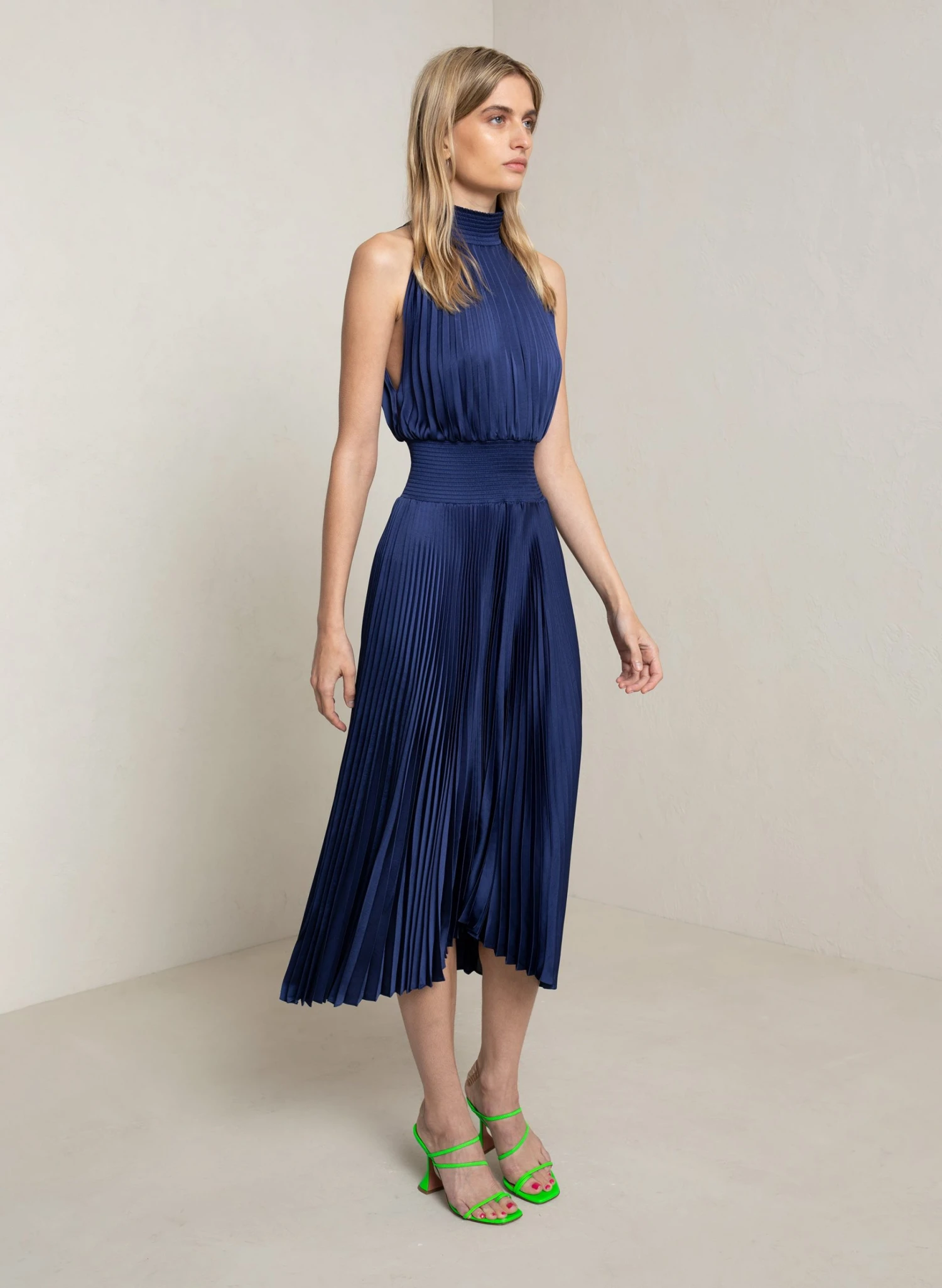 The Renzo Dress is crafted from lustrous vintage satin in an elegant teal hue. This midi silhouette features a halter neckline, smocked waist, and asymmetric hemline. Shop Dresses