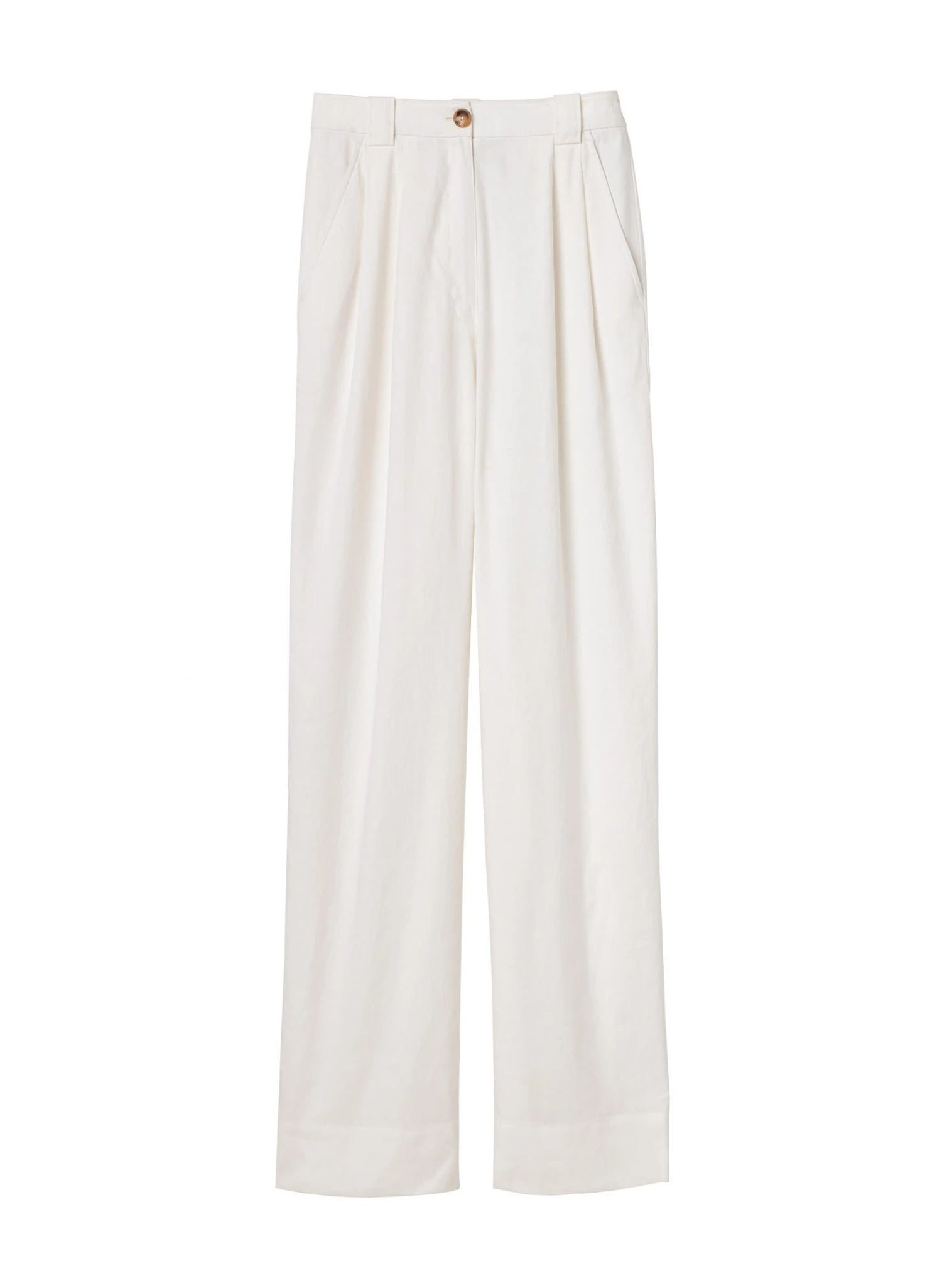 The Tommy Pant is crafted in our stretch cotton-linen blend in an off-white hue. This pleated silhouette is intended to fit with a subtle slouch, featuring a low-rise waist and wide legs. We recommend to size down one size from your typical size.