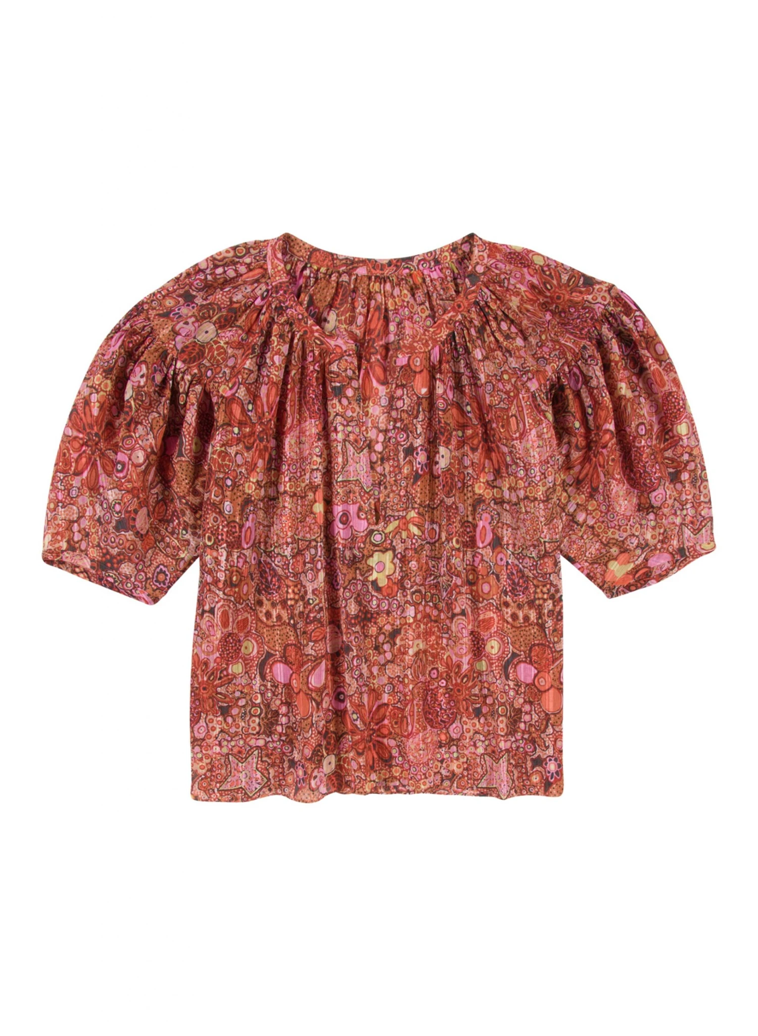 The Julianna Top is crafted in our crinkle cotton-silk blend in a retro-inspired floral print. This fluid silhouette features dropped, elbow-length puff sleeves, and a V-shaped neckline.